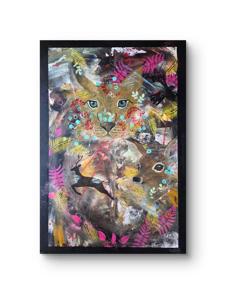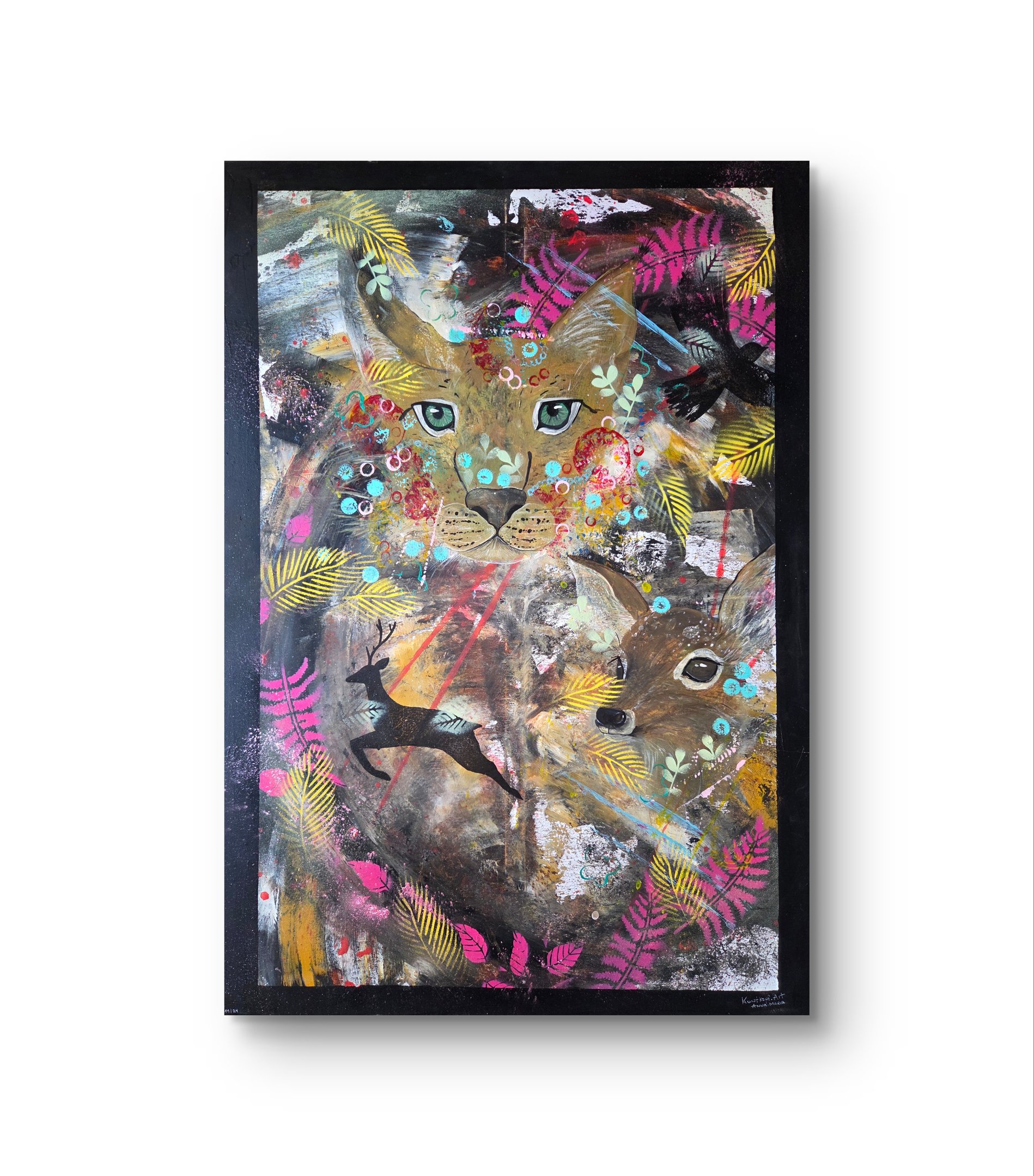 Das Gemälde wurde handgemalt mit hochwertigen Acrylfarben auf Leinwand. Unterschiedliche Maltechniken wie das Arbeiten mit Gegenständen, expressive Wischtechniken sowie gezielte Effekte mit Spraydosen verleihen der Oberfläche Struktur und Lebendigkeit. Die harmonische Verbindung aus warmen Naturtönen und dynamischen Farbkontrasten lässt das Tier aus dem abstrakten Hintergrund hervortreten und verstärkt die geheimnisvolle Ausstrahlung des Motivs.