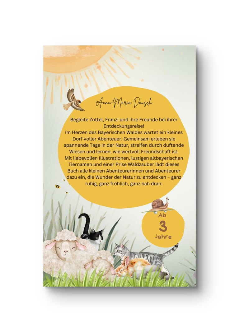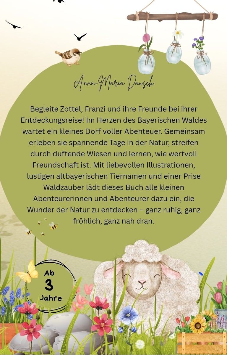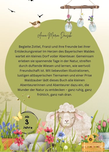 Willkommen im Herzen des Bayerischen Waldes! Begleite Zottel, das kuschelige Schaf, und seine neugierige Tochter Franzi auf eine wundersame Reise durch ein kleines Dorf voller Abenteuer. Jeden Tag gibt es etwas Neues zu entdecken – geheimnisvolle Tiere, bunte Wiesen, raschelnde Wälder und viele tierische Freunde, die kleine Leserinnen und Leser zum Staunen bringen.